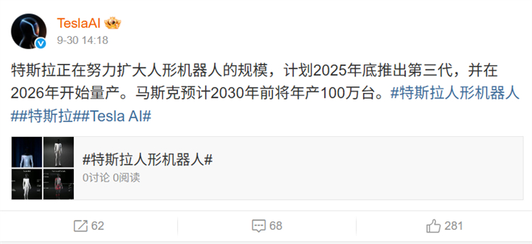 值得一提的是,就在幾日前(9月30日),TeslaAI微博官方賬號發文稱,特斯拉正在努力擴大人形機器人的規模,計劃2025年底推出第三代,並在2026年開始量產。馬斯克預計2030年前將年產100萬台。